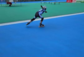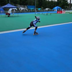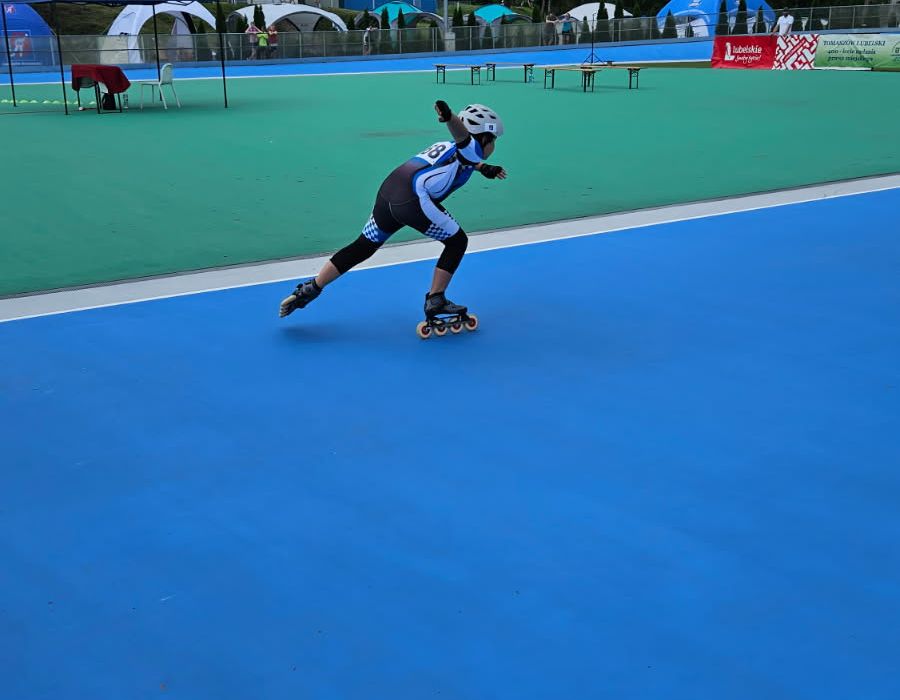Na zdjęciu Gabryś Wieczorek podczas Ogólnopolskich Zawodów Łyżworolkowych w Tomaszowie Lubelskim, gdzie zdobył 2 złote i 2 srebrne medale.